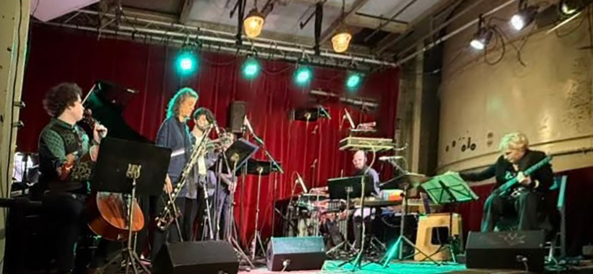 De BREBL V3-zaal zit bijna vol, de nieuwe kachel heeft de ruimte zojuist met flink wat herrie op temperatuur gebracht. Het relatief kleine podium staat propvol, zeven musici met percussie/elektronica, een vleugel, theremin, elektrische gitaar en blazers vormen een indrukwekkende bezetting.