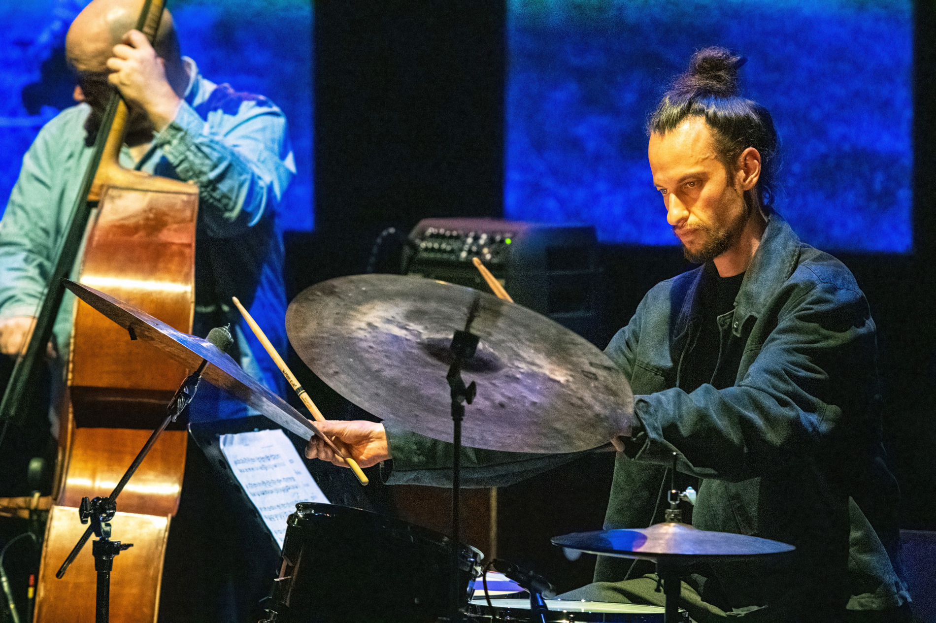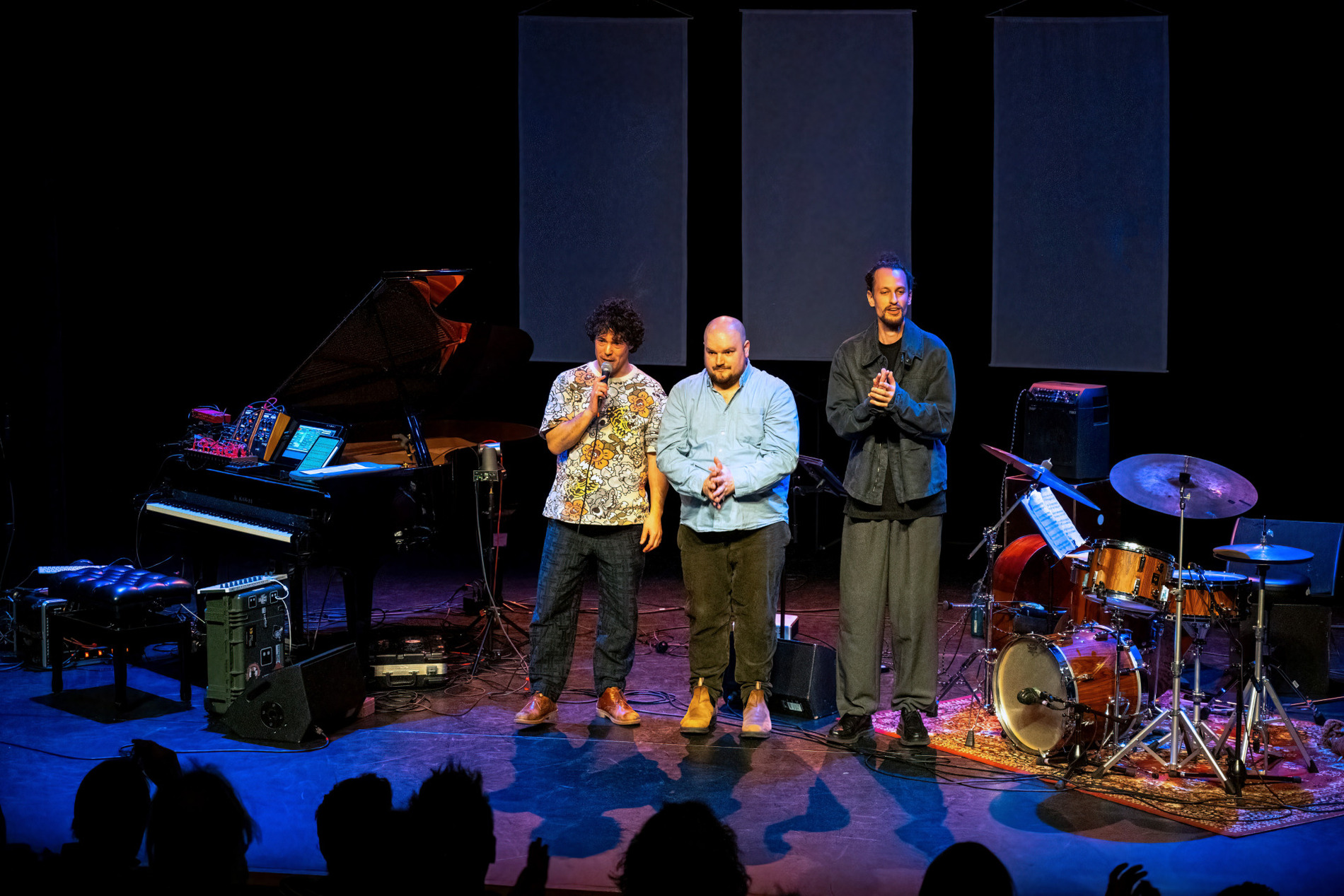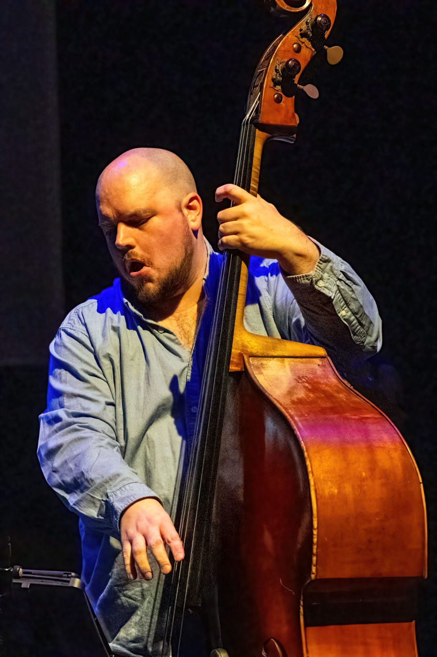Rond de vleugel staat een kleine wereld van elektronica, terwijl drie camera’s het podium aftasten en livebeelden naar de schermen achter het trio sturen. Dan snijdt een bassolo door de ruimte, direct gevolgd door een videofragment waarin een golfer de perfecte swing uitlegt. Het trio haakt ogenblikkelijk in: het volgt de toonhoogte en het ritme van de gesproken woorden, die vervormd en herhaald terugkeren als muzikaal materiaal. Beeld en geluid grijpen in elkaar, en meteen voel je: dit is hun visitekaartje.