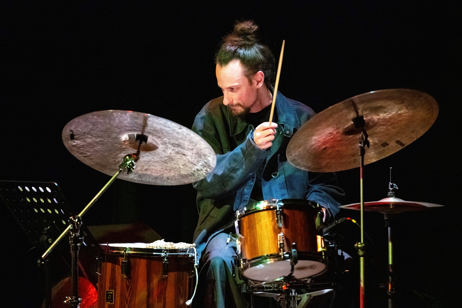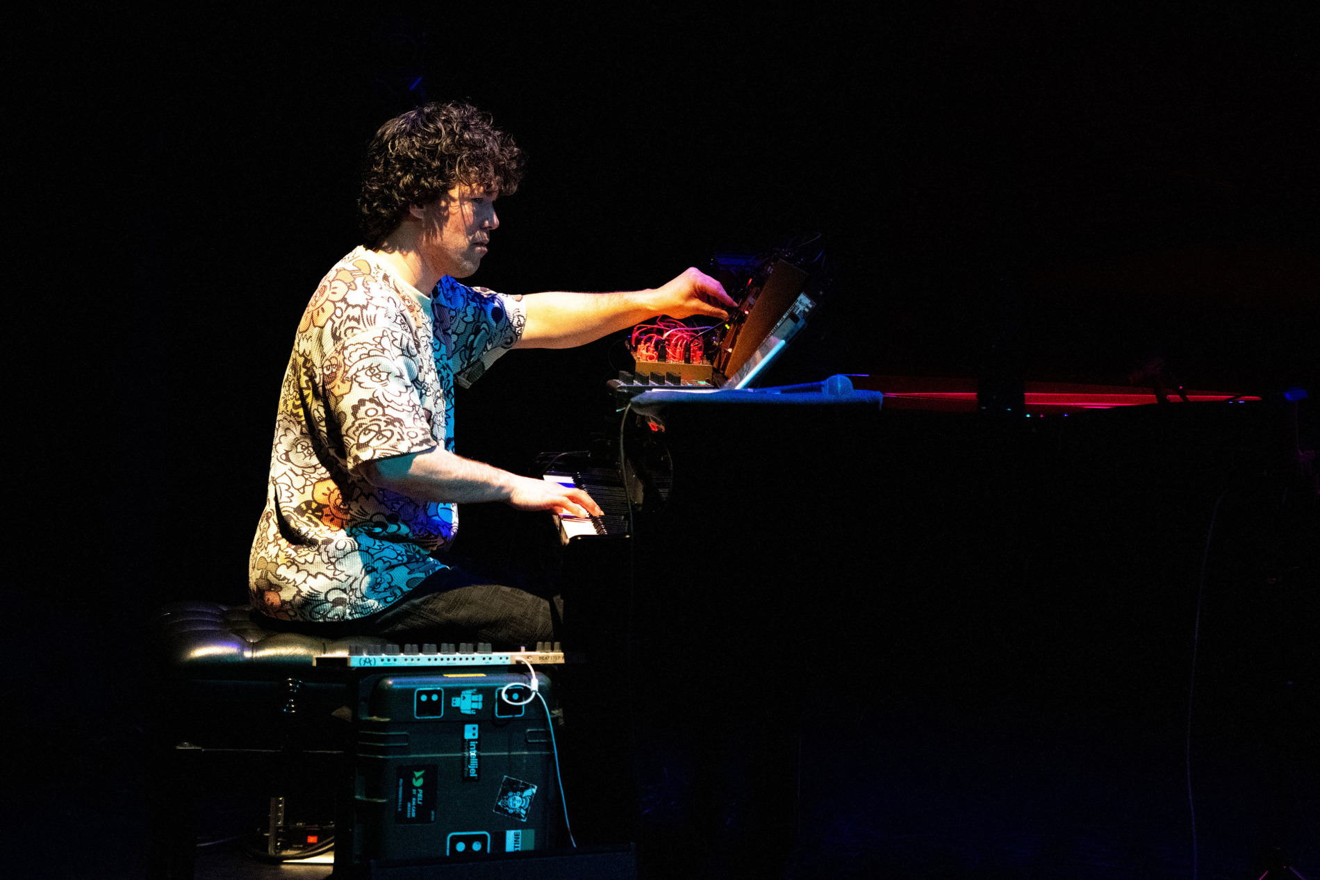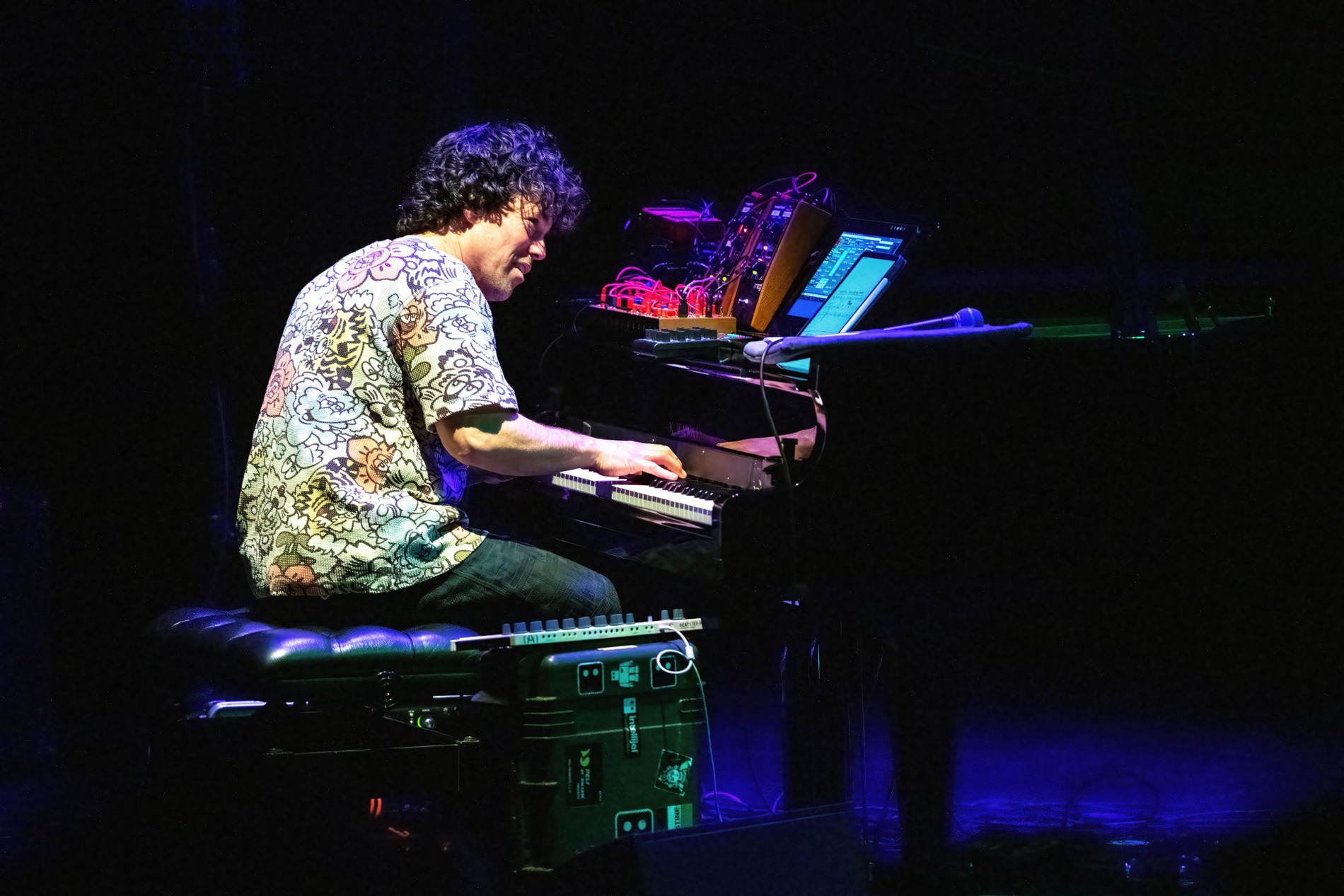 Rond de vleugel staat een kleine wereld van elektronica, terwijl drie camera’s het podium aftasten en livebeelden naar de schermen achter het trio sturen. Dan snijdt een bassolo door de ruimte, direct gevolgd door een videofragment waarin een golfer de perfecte swing uitlegt. Het trio haakt ogenblikkelijk in: het volgt de toonhoogte en het ritme van de gesproken woorden, die vervormd en herhaald terugkeren als muzikaal materiaal. Beeld en geluid grijpen in elkaar, en meteen voel je: dit is hun visitekaartje.