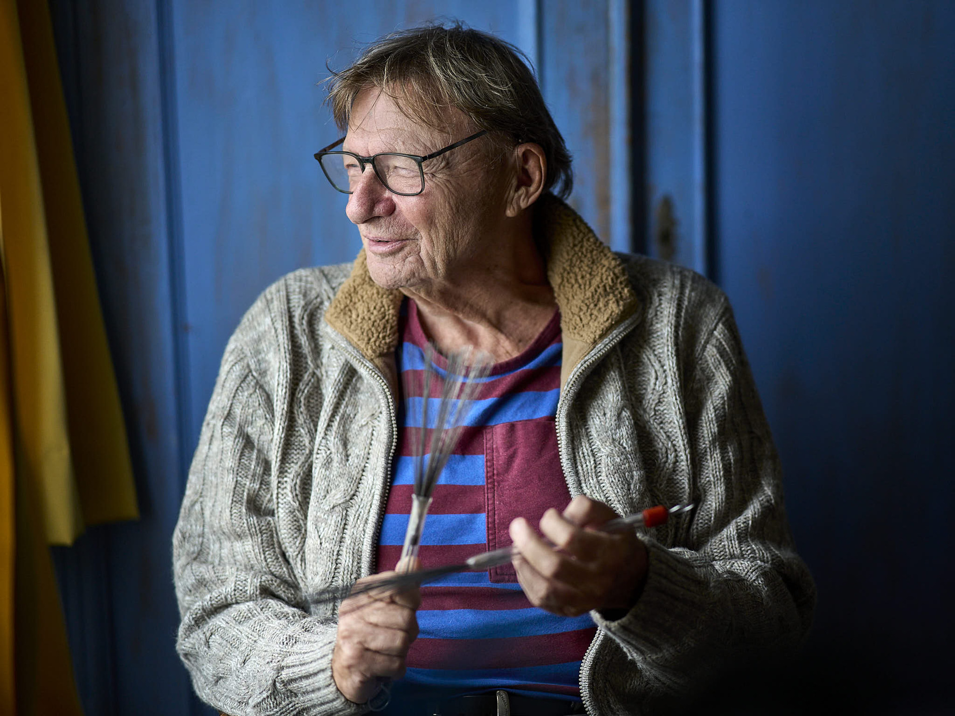 Pierre in de oefenruimte op zijn woonboot, onder het toeziend oog van John Coltrane (rechtsboven).