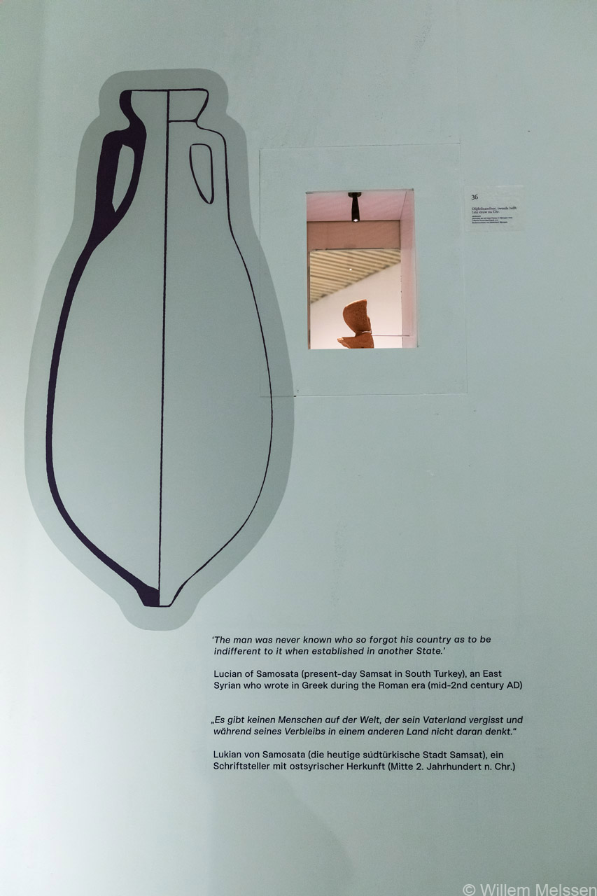 De tentoonstelling is ingedeeld volgens verschillende thema’s en elk thema laat twee kanten zien: de Romeinse en het heden. Het voert te ver om hier elk thema te behandelen, maar een rode draad door elk thema gaat over thuis zijn, je thuis voelen. Tacitus vroeg zich tweeduizend jaar geleden al af wat mensen uit Afrika en rond de Middellandse Zee in vredesnaam te zoeken hadden in dit koude zompige moeras, maar ook in deze tijd vinden die mensen nog steeds hun weg hierheen en doen er alles aan om zich hier thuis te voelen. Soms hebben ze daar een schuilplaats en koffie voor nodig, maar meestal gaan ze op in het grote geheel, waarbij ze delen van hun eigen cultuur meenemen en integreren in het land waar ze terecht zijn gekomen. Zo ontstaat een nieuw geheel. Met olijfolie en koffie. Alleen uit de naam is soms nog de herkomst af te leiden. Net zo goed als het Romeinse leger bestond uit mensen die van oorsprong uit diverse delen van het Rijk kwamen, zo is de huidige samenleving ook geworteld in alle uithoeken van Europa en daarbuiten. En deze tentoonstelling laat heel duidelijk zien dat dit alleen maar een verrijking is.