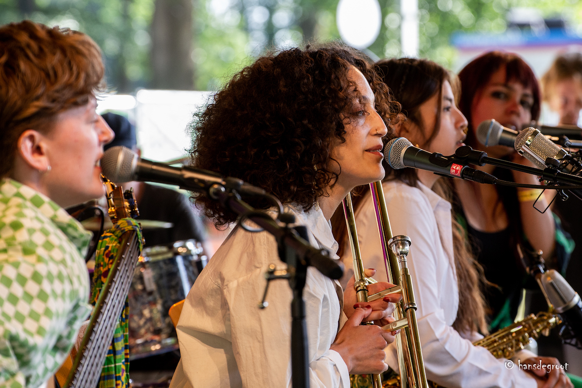 Het Music Meeting Festival wordt afgesloten met het geheel uit (feministische) vrouwen bestaande Collectivauit de UK. De zes activistische musici zijn een collectief en spelen latinmuziek op een hoog niveau. De stukken zijn gevarieerd, origineel en hebben mooie arrangementen. Vette krachtige salsa soms, zeer dansbaar maar dus niet macho/hanig! Er wordt heerlijk gedanst.
