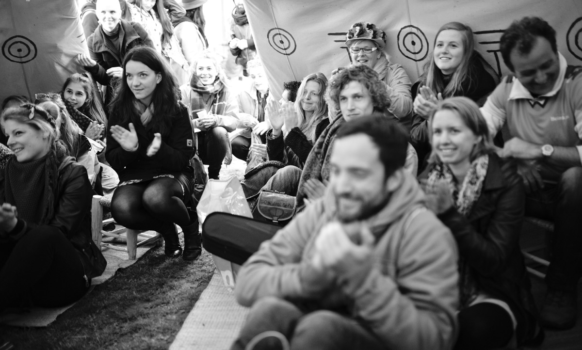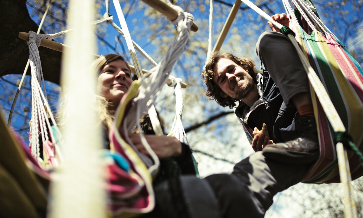Behalve twee podia en een tipi waar muzikanten hun kunsten vertonen, kun je ook in speciale hangmatten hoog in de lucht hangen. De sfeer is aangenaam, ook al is het nog rustig aan het begin van de middag.