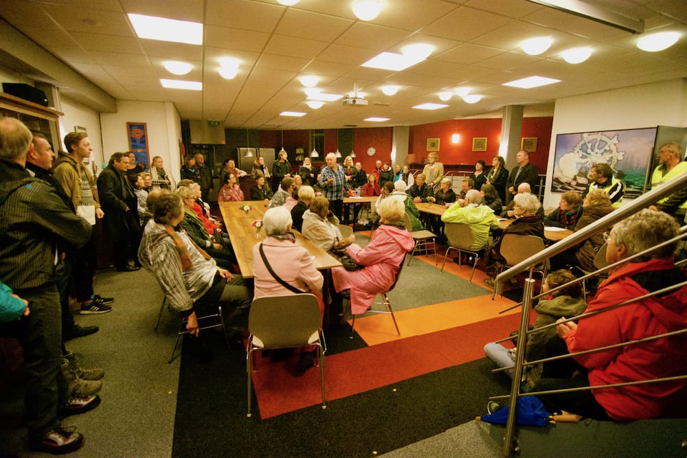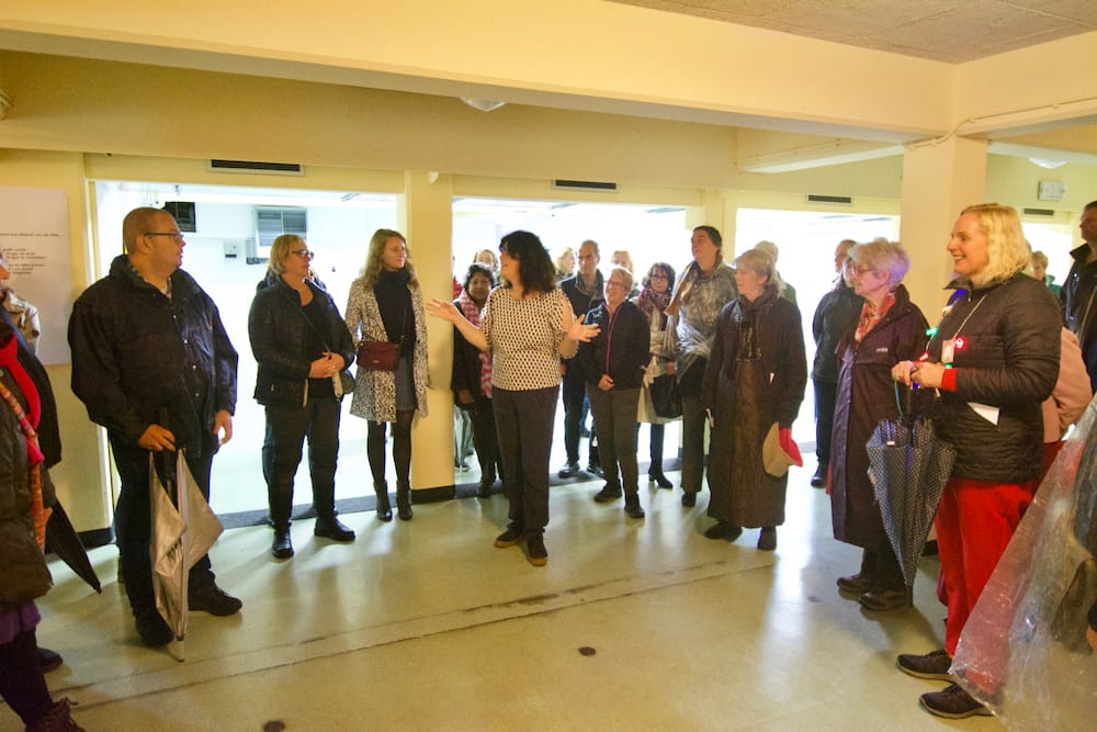 Maar die regen! Die is toch wel de grote spelbreker van de avond. Op een zorgvuldig door organisator Doro Krol uitgekiend programma staan maar liefst elf locaties die we tijdens de wandeling aandoen, met evenzoveel sprekers of acts. Maar al snel wordt besloten de route in te korten en zoveel mogelijk van binnenlocatie naar binnenlocatie te gaan, waarbij degenen die buiten vóór een markant gebouw uit de wijk zouden spreken, hun verhaal binnen mogen houden.