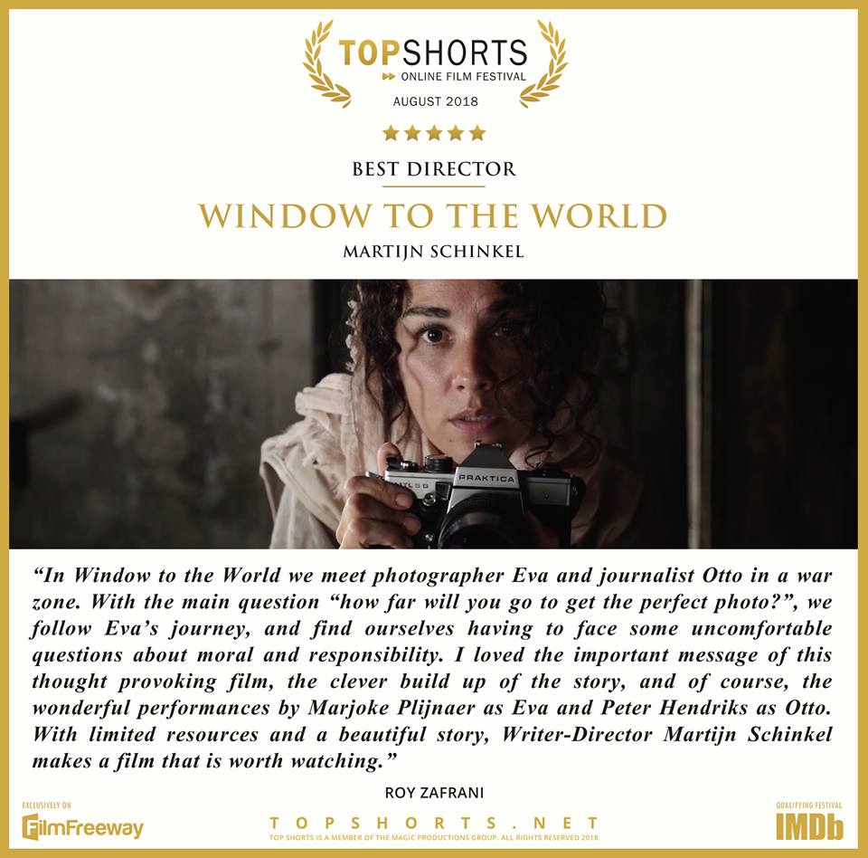 Window on the World won al awards voor beste narratieve film, beste regisseur, beste montage en beste actrice op het Amerikaanse online-filmfestival Top Shorts. De One-Reeler Film Competition in LA heeft een eervolle vermelding gegeven. Plijnaer haalde ook in het Schotse Glasgow een prijs binnen voor haar acteerwerk. En verschillende andere festivals hebben de short van Schinkel al geselecteerd.