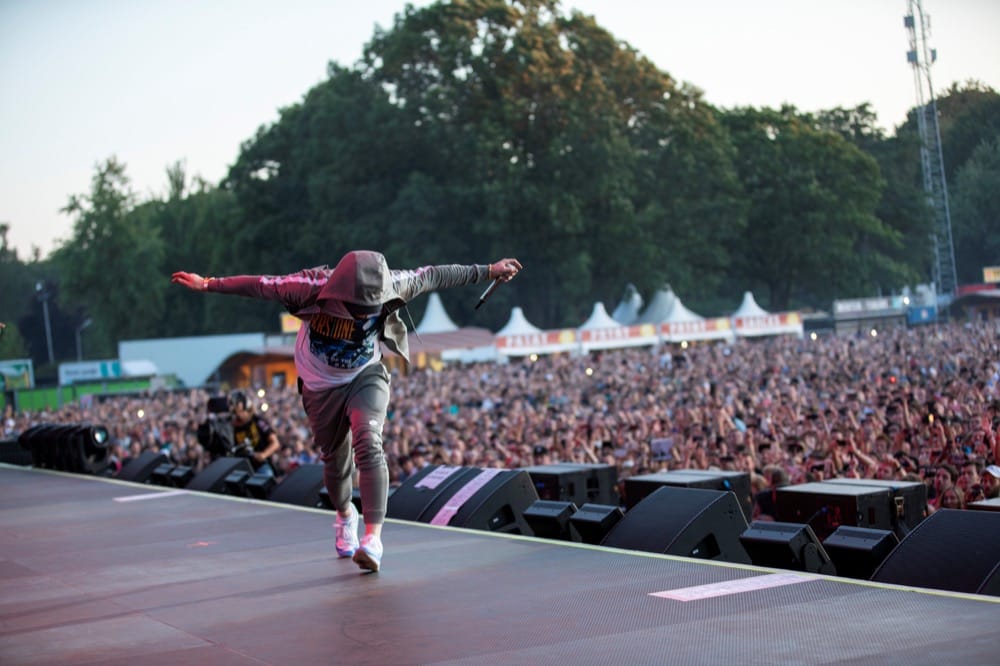 Voordat het echter zover is dat de baas zelf zijn opwachting maakt, wordt het publiek, ondanks de hoge temperatuur in het park, nog verder opgewarmd door twee voorprogramma’s, twee artiesten die passend en bekend zijn bij de huidige generatie hiphopfans. De eerste bezoekers staan toch al wel zo’n 2,5 uur voor het hek te wachten als Royce da 5’9” zijn opwachting maakt. Zijn act valt in goede aarde, zij het voornamelijk bij de jonge mensen in de zgn. Golden Circle en hen die direct daarachter tegen het hek aan staan. Verderop op het veld liggen mensen nog her en der te zonnen, wordt vooral bier gehaald, gekletst en gerookt, maar niet zoveel op de huidige act gelet.