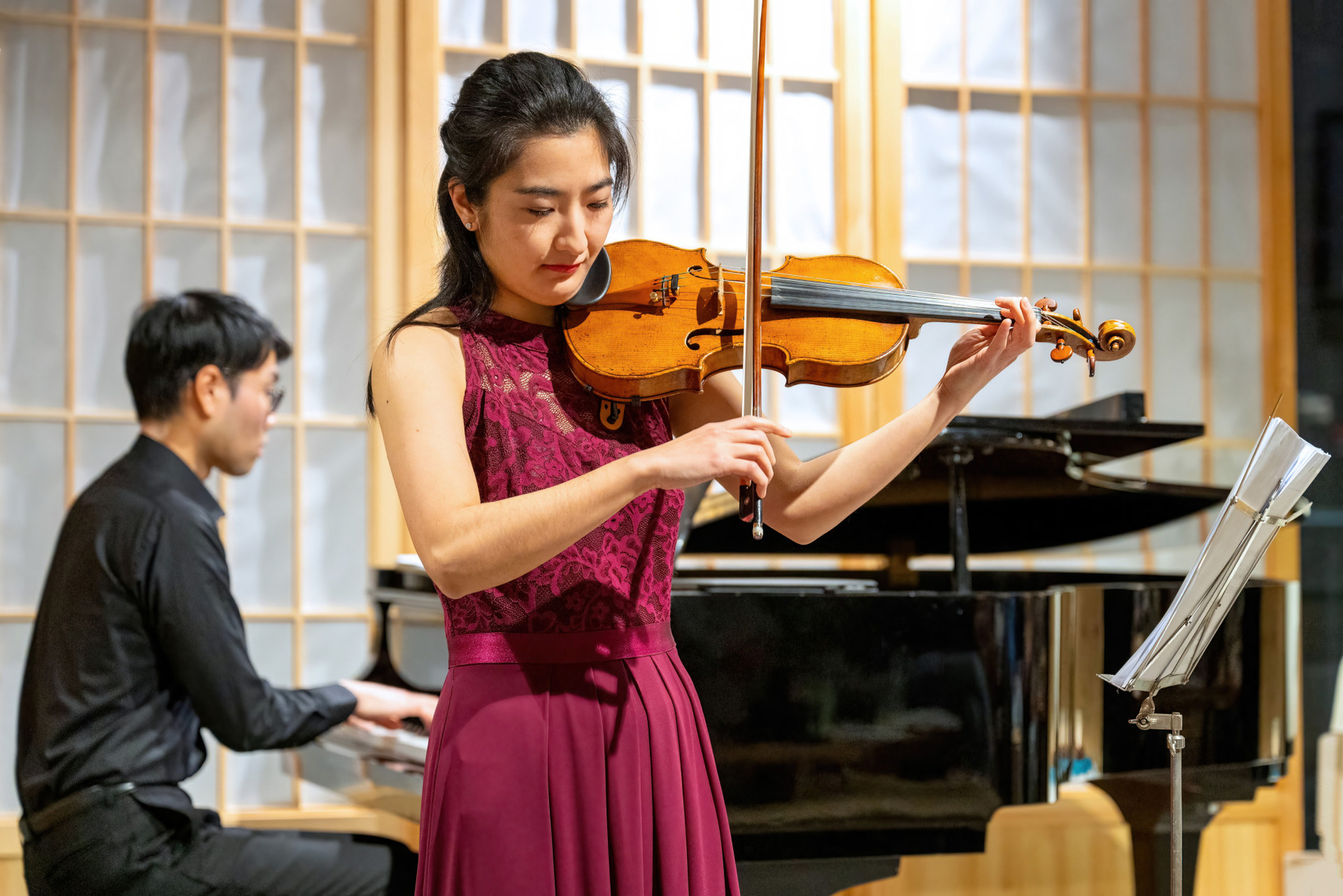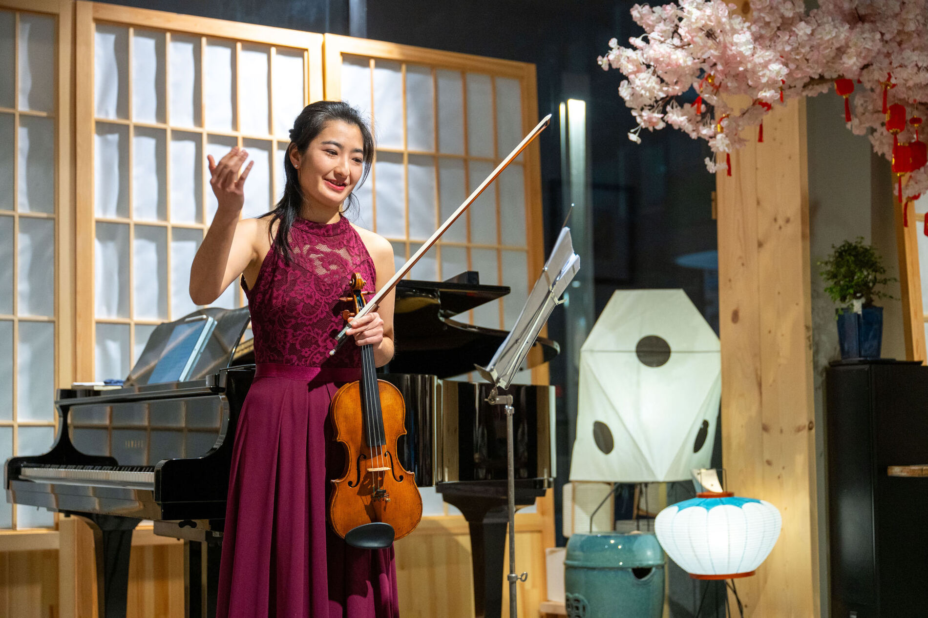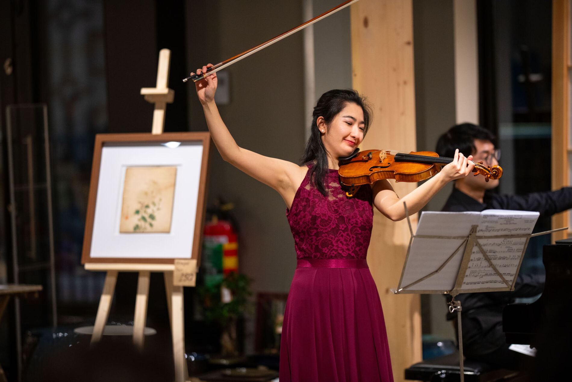 Het contrast met de Europese werken na de pauze is duidelijk hoorbaar. In delen uit Beethovens Frühlingssonate en Vivaldi’s Vier Jaargetijden klinkt meer harmonische spanning, dramatiek en virtuoze dialoog tussen viool en piano. De muziek beweegt sterker vooruit, zoekt contrast en dynamiek, waar de Japanse werken eerder verstilling en klankruimte omarmen. De setting van het concert – tussen Japanse gebruiksvoorwerpen, servies en kunst – versterkt op prachtige wijze de zachte sfeer van de Japanse muziek, zoals bij de toegift Furosato voelbaar is.