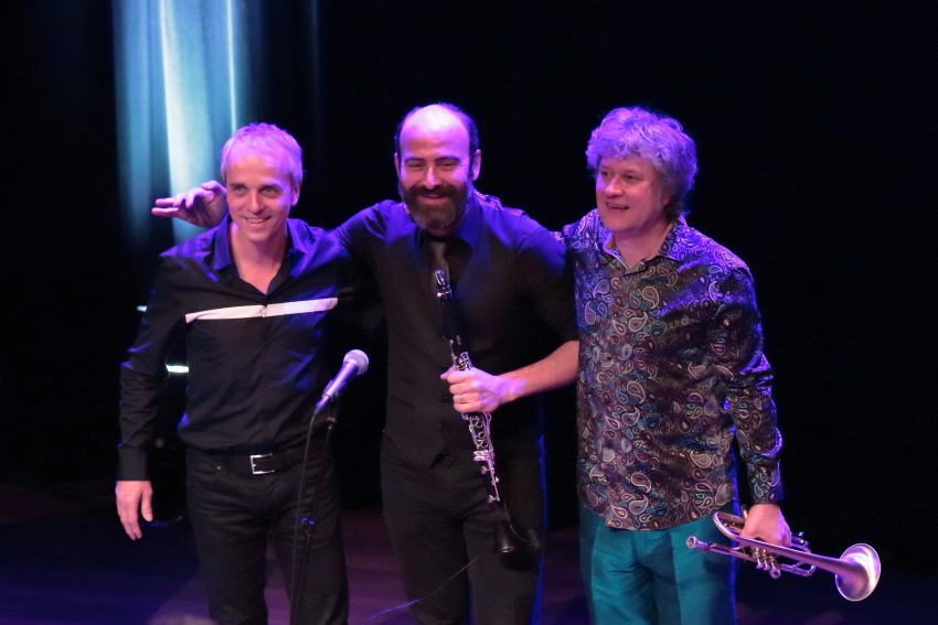 Eric Vloeimans, Kinan Azmeh en Jeroen van Vliet hebben alle drie indrukwekkende carrières maar ze zijn gelukkig heel gewoon gebleven. “Als je iets tegen ons zegt, zeggen we iets terug.” Eric Vloeimans is niet alleen een begenadigd trompettist, hij is ook een begaafd causeur. Hij maakt vaak contact met zijn publiek en praat de stukken op een onderhoudende wijze aan elkaar. Zoals met zijn verhaal over de stierenvechter - The Sad Toreador -, tot in alle vezels gespannen voor de strijd… maar de stier komt niet opdagen. Verklaringen heeft Vloeimans niet maar “niks is voor niks”. Veel van Vloeimans’ verhalen hebben zo’n absurdistische twist, zo’n (lullige) anticlimax, maar dat geldt niet voor de muziek. Hij wil met zijn muziek niets minder brengen dan “geluk, dat als warme chocolademelk in je stroomt.” Dat lukt heel goed, getuige de reacties in de uitverkochte zaal.