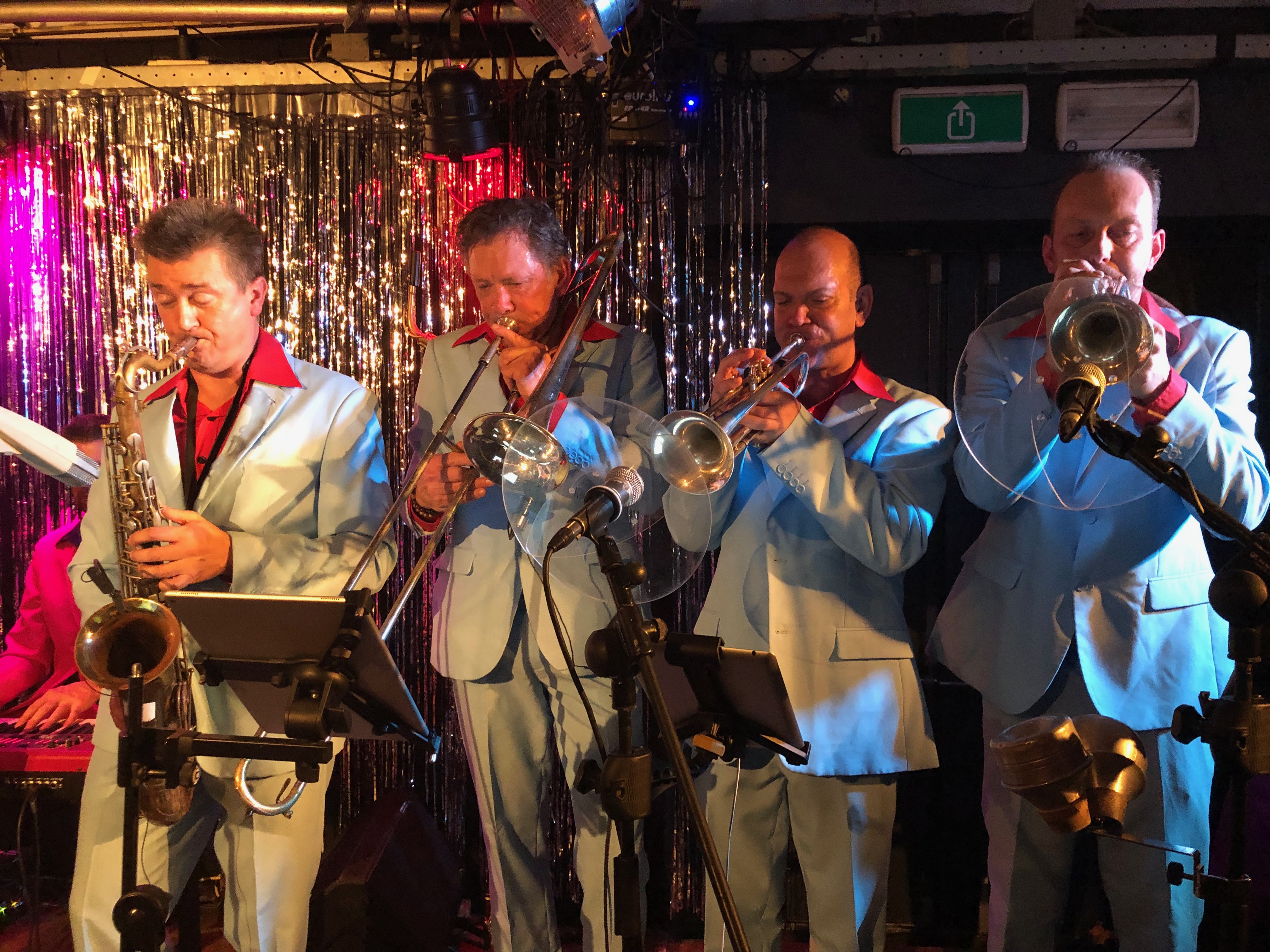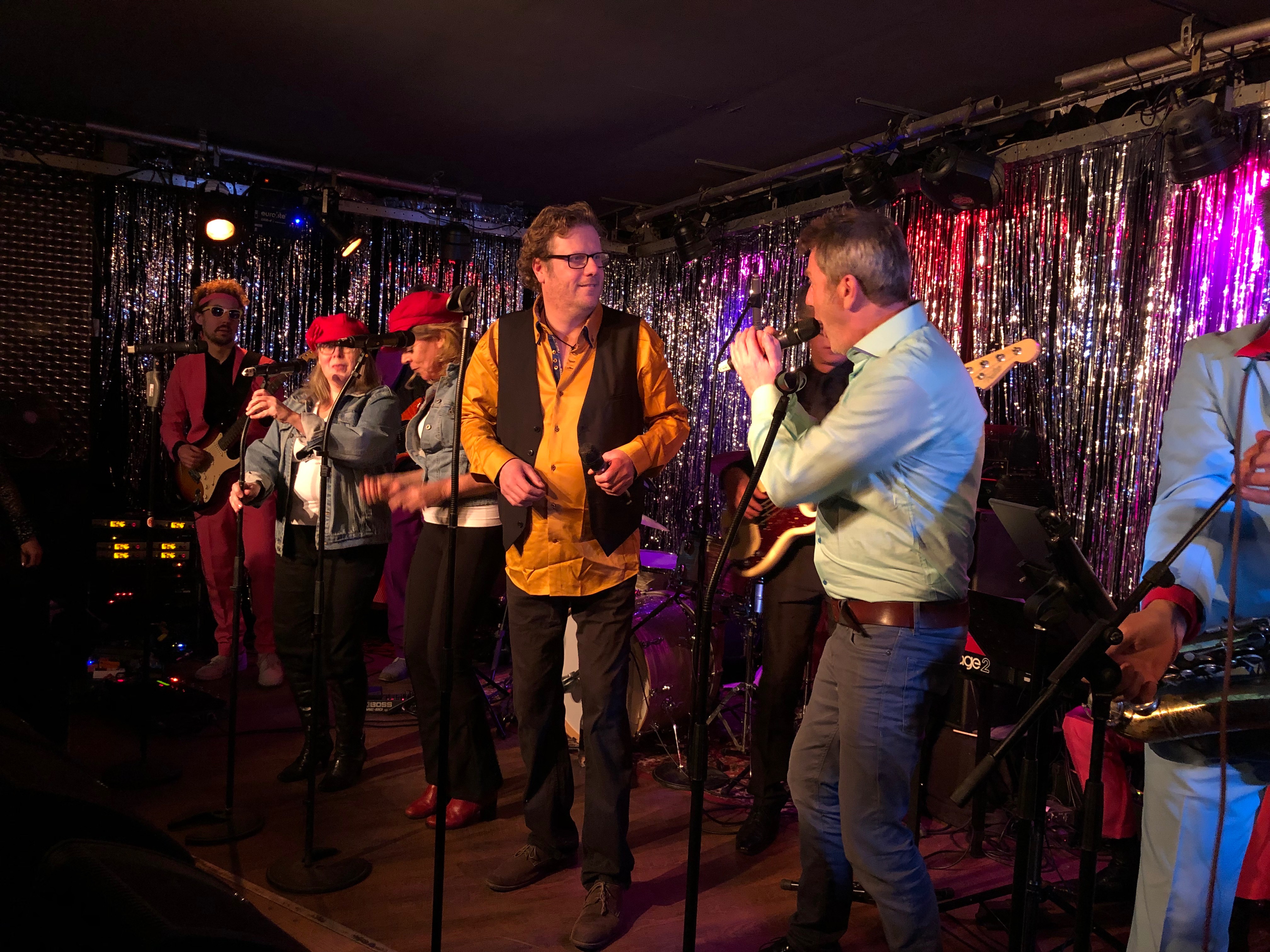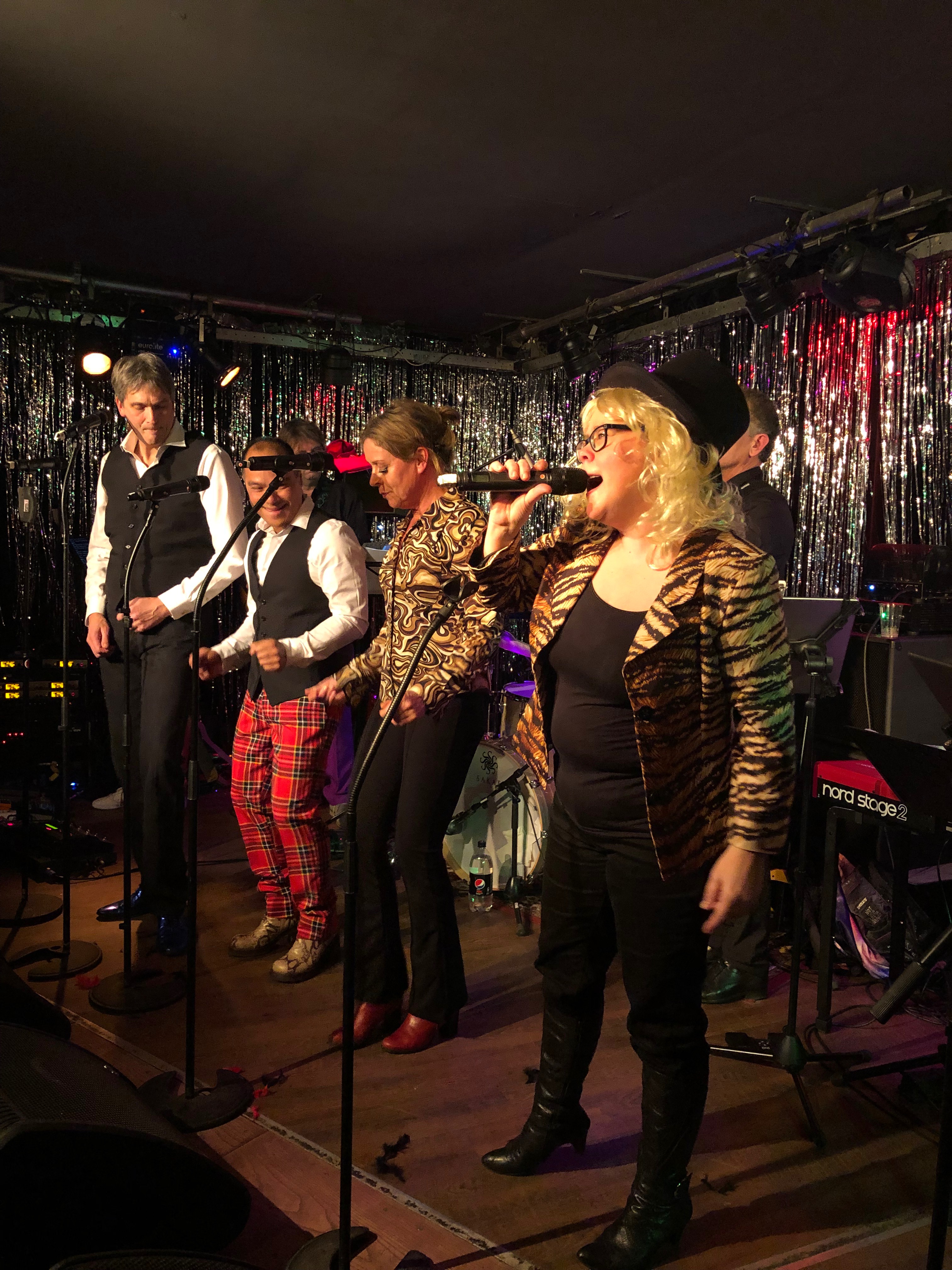 De Trianon House band bestaat uit maar liefst tien personen aangevuld met, voor de gelegenheid, vijftien zangers en zangeressen. Uit de Top2000 komen ongeveer 35 nummers voorbij in drie sets. Met zoveel omkleden heb je wel even pauze nodig. Wie wel eens in het zaaltje achterin Café Trianon is geweest, kent de omvang van het podium. Knap dat je daar twee gitaristen, een drummer, een toetsenist, vier blazers en een wisselende samenstelling van vocalisten op kwijt kunt. Volle bak dus, op het podium en in de zaal.