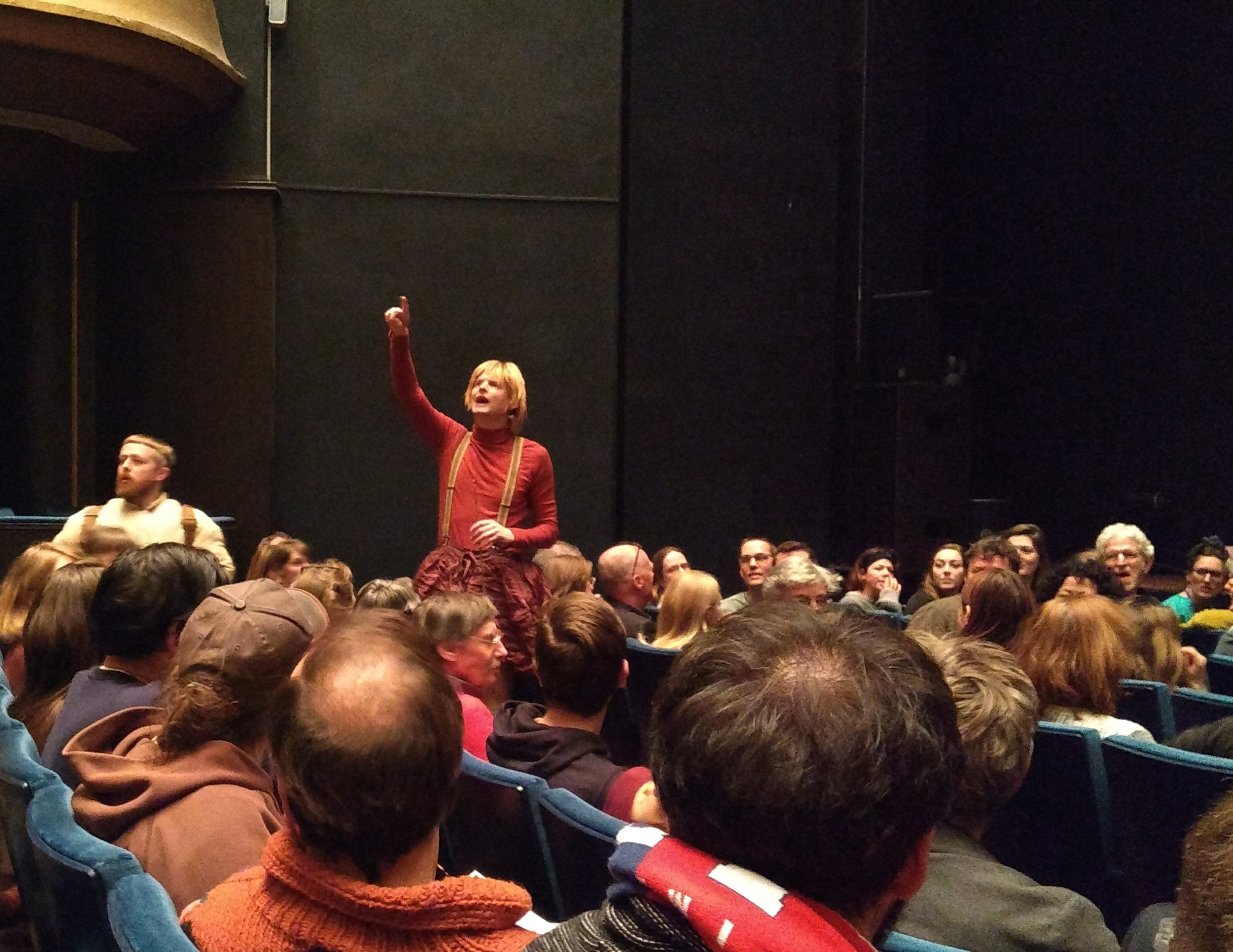 “Robin Hoooood! Robin Hoooood!” schallen zijn metgezellen door de gangen van het theater. De middeleeuwers roepen ons, het publiek, de zaal in, alwaar wij stevig worden toegesproken. De verkiezingsretoriek is niet van de lucht en de slogans vliegen ons om de oren. Van een vierde wand is geen sprake in dit uitbundige schouwspel. “Schaf armoede af!” scanderen wij braaf mee, waarna ons plots het vuur aan de schenen wordt gelegd: “Zijn er bankieren in de zaal? Of accountants? Controllers? Niemand? Wie doet er iets met geld?!”. De dappere enkeling die zijn hand durft op te steken, komt dit duur te staan. Laten we maar aannemen dat iedereen zijn bezittingen aan het eind van deze première weer bij zich had.
